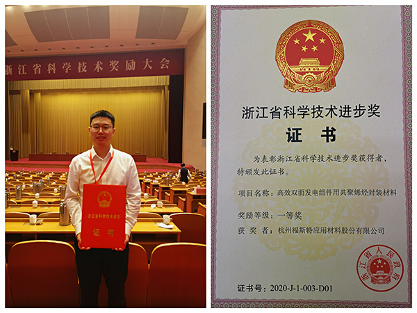 6月15日下午,浙江省科學技術獎勵大會在浙江省人民大會堂隆重舉行,由杭州福斯特應用材料股份有限公司和浙江大學共同完成的 “高效雙面發電組件用聚烯烴封裝材料”項目榮獲浙江省科技進步一等獎。