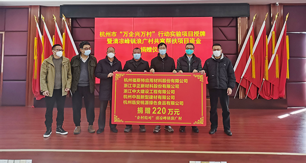 12月21日,杭州市“萬企興萬村”行動實驗項目授牌暨清涼峰鎮浪廣村共富幫扶項目資金捐贈儀式在清涼峰鎮政府舉行。杭州市工商聯黨組成員、二級巡視員毛福俊,區委常委、統戰部長陳娜,區人大原副主任、慈善總會會長羅石榮,區工商聯黨組書記樓金山,清涼峰鎮黨委書記錢波,區工商聯主席、杭州福斯特應用材料股份有限公司董事長林建華等參加活動。