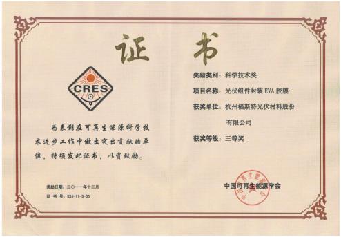 福斯特的“光伏組件封裝EVA膠膜”項目獲得中國可再生能源學會的“科學技術獎”。