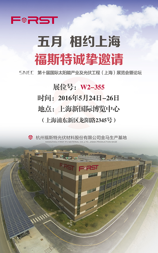 福斯特,全球領先的EVA太陽能膠膜、烯烴膠膜、背板材料供應商,誠摯邀您參加2016上海SNEC展會。福斯特展位號:W2-355,時間2016年5月24日-26日,地點:上海新國際博覽中心(上海浦東新區龍陽路2345號)。期待您的光臨!