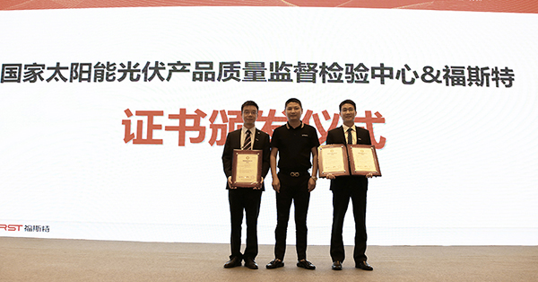 吳建國院長致辭并為福斯特榮膺“中國光伏行業協會EVA工作組組長單位”授牌,并與林建華董事長共同簽訂國家太陽能光伏產品質量監督檢驗中心&福斯特戰略合作協議。同時,福斯特POE膠膜(TF4)、背板(BEC-301T、BEC-306T)產品榮獲中心頒發的“高端綜合耐候性安全認證”證書,這是對福斯特產品品質和性能的高度肯定,更展現了福斯特在產品技術創新上的綜合實力。