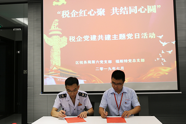 7月3日,主題黨日活動在福斯特總部舉行。雙方黨員代表根據活動主題進行了“微課演講”,加強企業供求同頻共振,開拓視野,啟迪思維。會中,雙方共同簽訂了《稅企黨建共建協議》,建立了稅企黨建合作新模式,通過共建共享進行優勢互補。座談會上,稅務局服務團對企業代表提出的問題進行了現場輔導解答,充分把握企業涉稅需求,服務企業健康發展。活動中,黨員們在黨旗下重溫了入黨誓詞,鞭策自己以更高昂的精神、更扎實的作風踐行對黨的莊嚴承諾。